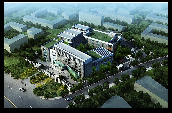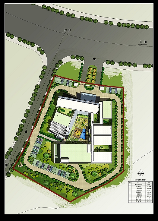 基地总用地面积为6353平方米。结合基地的地貌特征,确定梯形建筑控制线,布置“T”型的绿地轴于此形成呼应,总体布局根据绿地轴线布置,形成了多形态的空间组合。