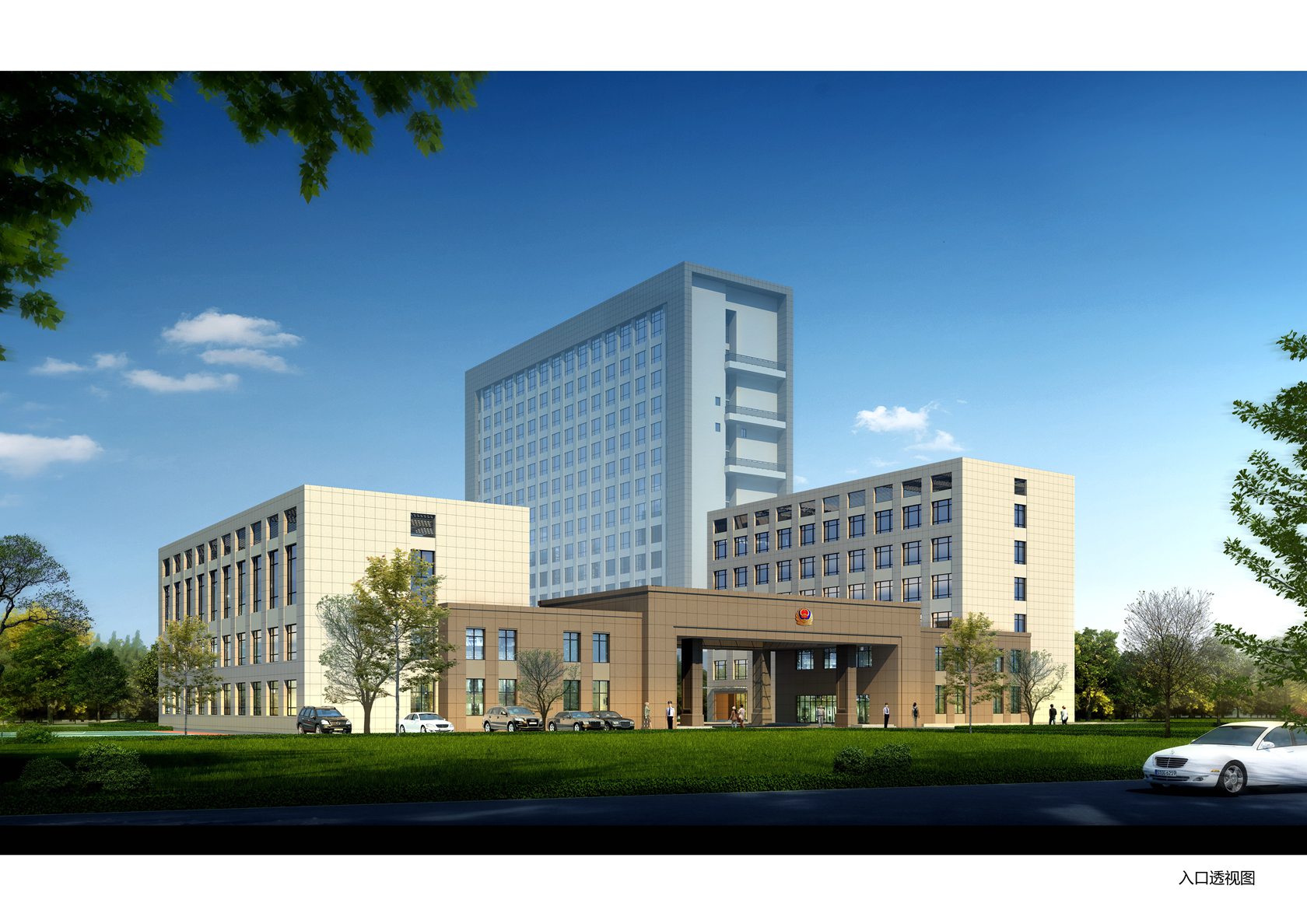 本案采用传统的院落布局,两栋南北向平行的主体建筑及一栋东西向裙房建筑围合而成大面积的半开放空间,既是中心景观广场又可作为平时室外训练场地使用;使用功能相似或有内在联系的建筑相对集中布置,用门廊加以联系,形成相互关联的群体结构。
